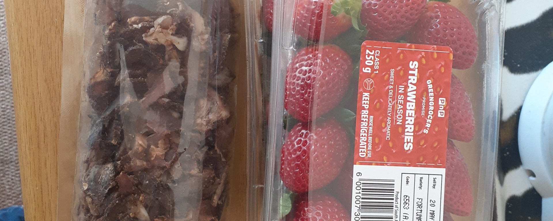 I made some pretty exciting purchases in my trip to the grocery store today. (Grocery store decisions are tricky because whatever I buy I have to carry home uphill, and I only go once a week, so the weight of impulse buys must be carefully limited.) I noticed goat cheese (one of my favs) in the store for the first time today! The strawberries looked excellent, so I got two cartons of those. I also bought biltong for the first time. Biltong is a very popular South African snack that is similar to beef jerky. I have had some in the past, but it hasn’t made my shopping list until now.